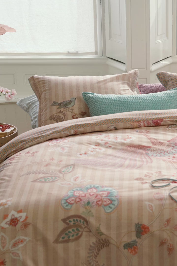 Η Pip Studio Buenas Noches Sand φέρνει την ατμόσφαιρα ενός ονειρεμένου εξωτικού παραδείσου στην κρεβατοκάμαρα. Το εντυπωσιακό σχέδιο περιλαμβάνει παπαγάλους, λουλούδια και φυλλωσιές σε απαλό μπεζ (sand) φόντο, δημιουργώντας μια αίσθηση χαλάρωσης και πολυτέλειας.